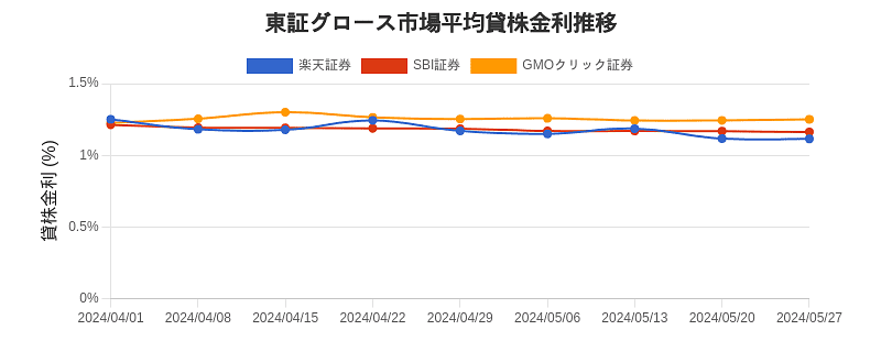 以下の画像は東証グロース株の平均貸株金利の推移です。楽天証券、SBI証券、GMOクリック証券などの大手ネット証券のグロース株の平均貸株金利は1%を優に超えます。