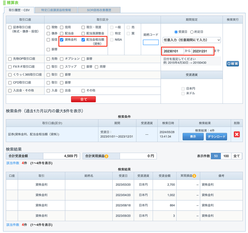 GMOクリック証券の場合は、精算表から「貸株金利」と「配当金相当額(貸株)」を選択肢、期間指定で1年分を抽出しましょう。