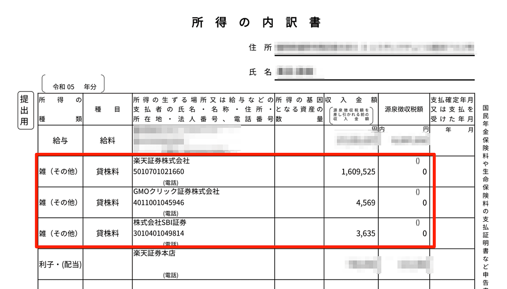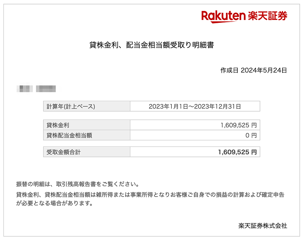 楽天証券の場合は、貸株料申告用に「貸株金利、配当金相当額受取り明細書」を出してくれており、こちらを使えば良く非常にラクです。